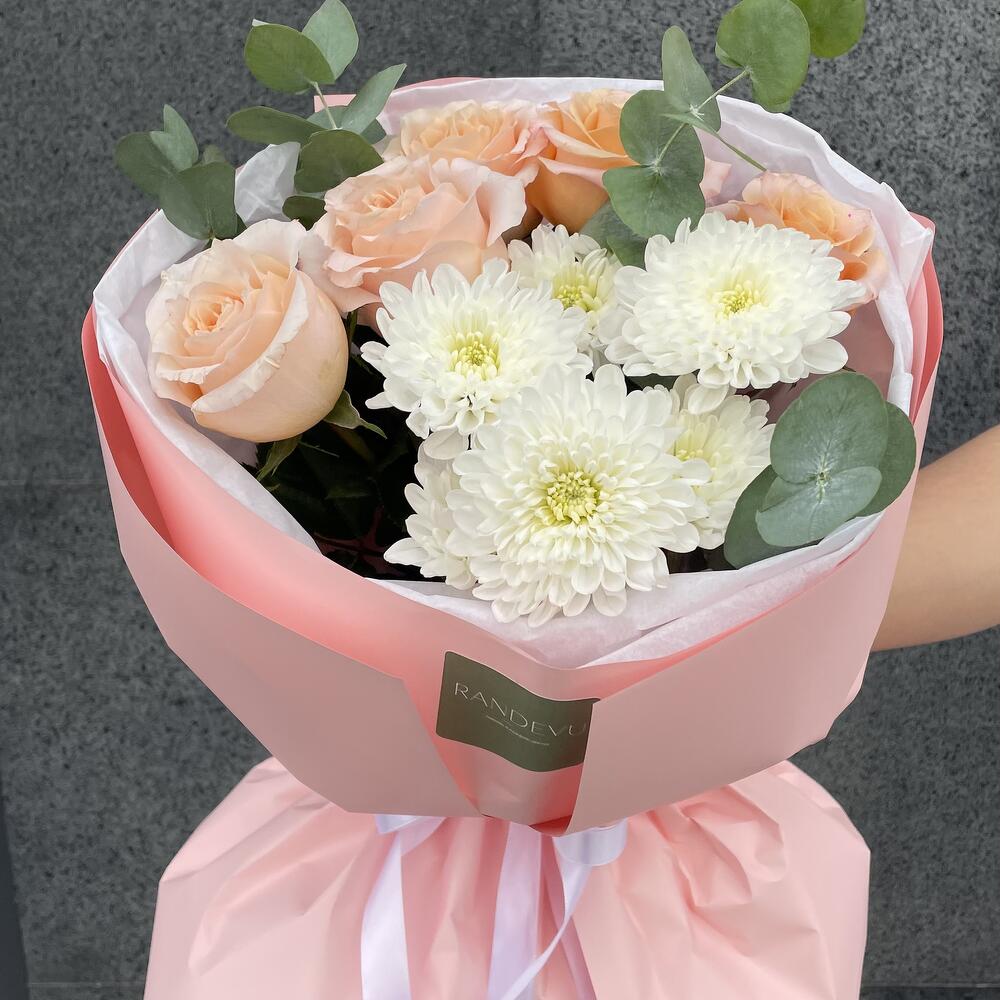 Chrysanthemum bush - 1 pcs Eucalyptus - 1 pcs Rose - 5 pcs Satin ribbon - 1 pcs Foamiran (packaging) - 3 pcs hookah packaging - 3 pcs