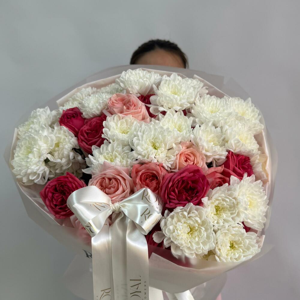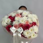 Комбинация классических кремовых хризантем и роз в розово-малиновых тонах. Нежный, но выразительный букет в стильной обёртке с роскошной лентой.