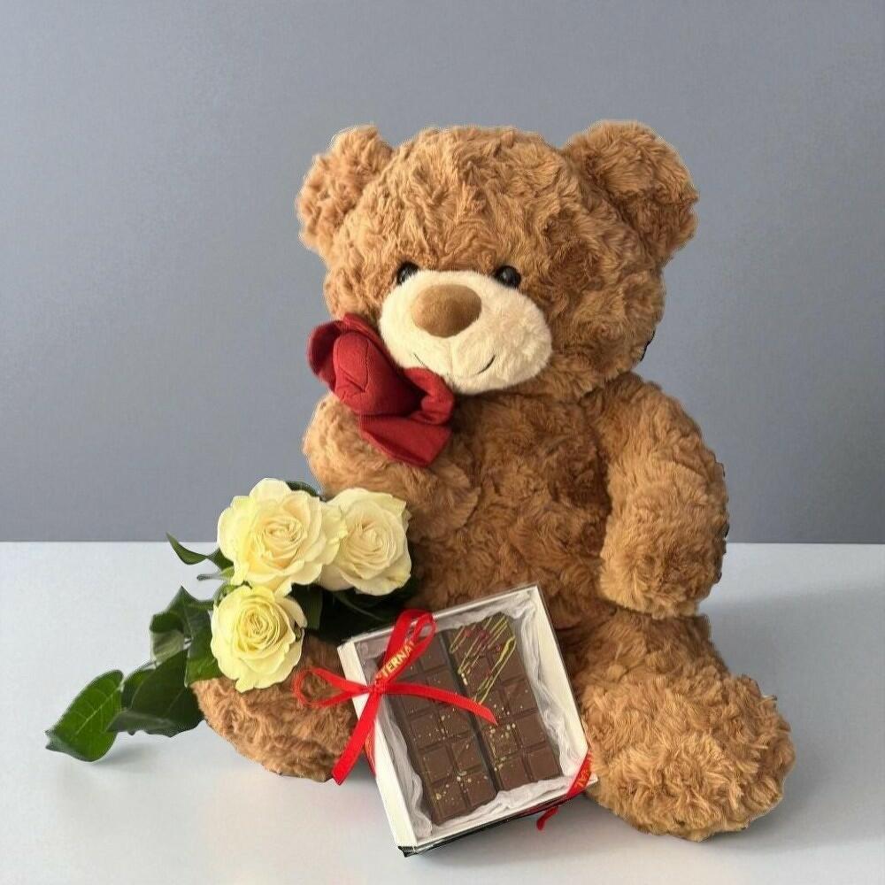 Очаровательный подарок, который передаёт тепло, заботу и любовь! Мягкий плюшевый мишка с красным сердцем в лапках станет символом ваших чувств, а нежные кремовые розы добавят романтики. Комплект дополнен дубайским шоколадом ручной работы в стильной упаковке с лентой. Такой набор идеально подойдёт для признания в любви, поздравления с днём рождения или просто чтобы поднять настроение близкому человеку. Чтобы цветы дольше радовали своей свежестью, поставьте их в воду, предварительно обновив срезы под углом. Избегайте прямых солнечных лучей и источников тепла. Шоколад рекомендуется хранить в прохладном, сухом месте.