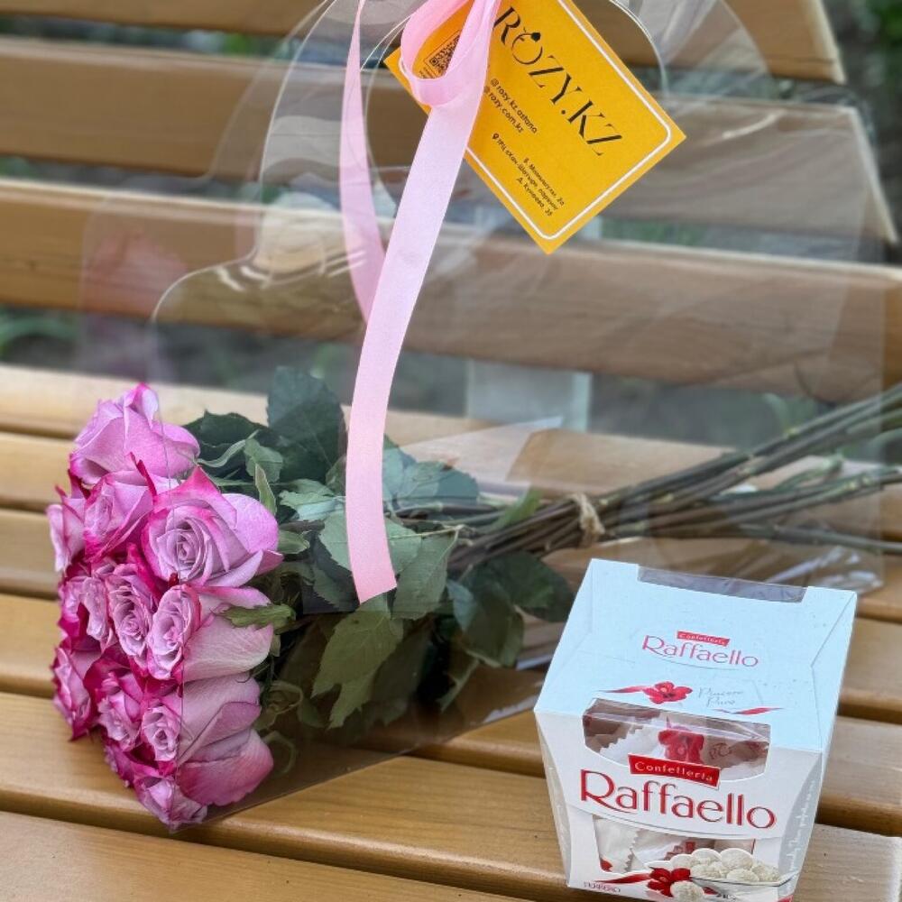 Комбо 15 фиолетовых роз в прозрачной сумочке и рафаэло