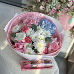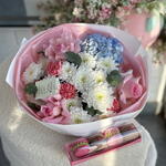 Hydrangea - 1 pcs Eucalyptus - 2 pcs Chrysanthemum - 3 pcs Dianthus - 3 pcs openwork roses - 3 pcs macaron (filling of your choice) - 4 pcs