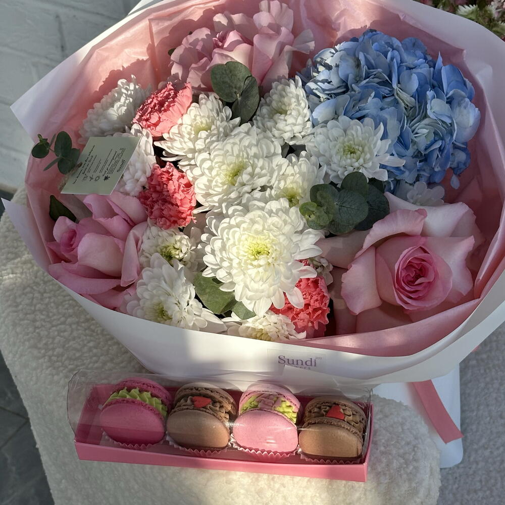 Hydrangea - 1 pcs Eucalyptus - 2 pcs Chrysanthemum - 3 pcs Dianthus - 3 pcs openwork roses - 3 pcs macaron (filling of your choice) - 4 pcs