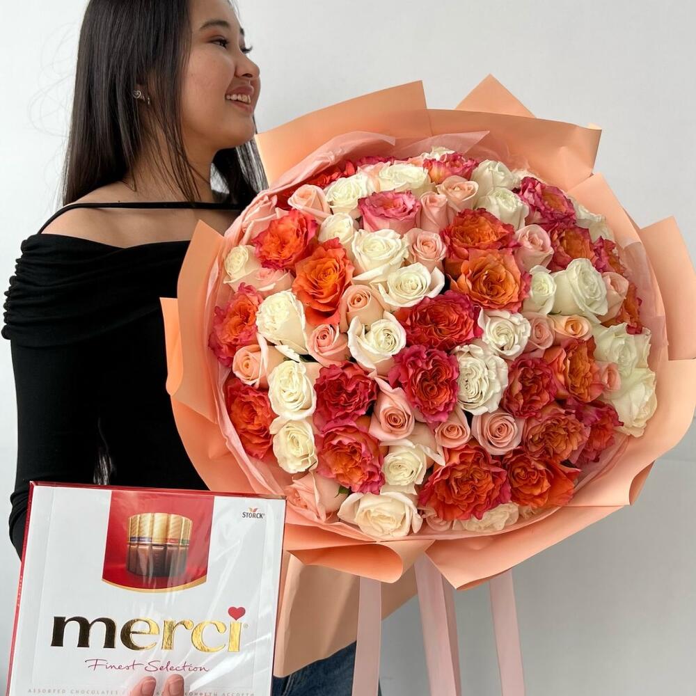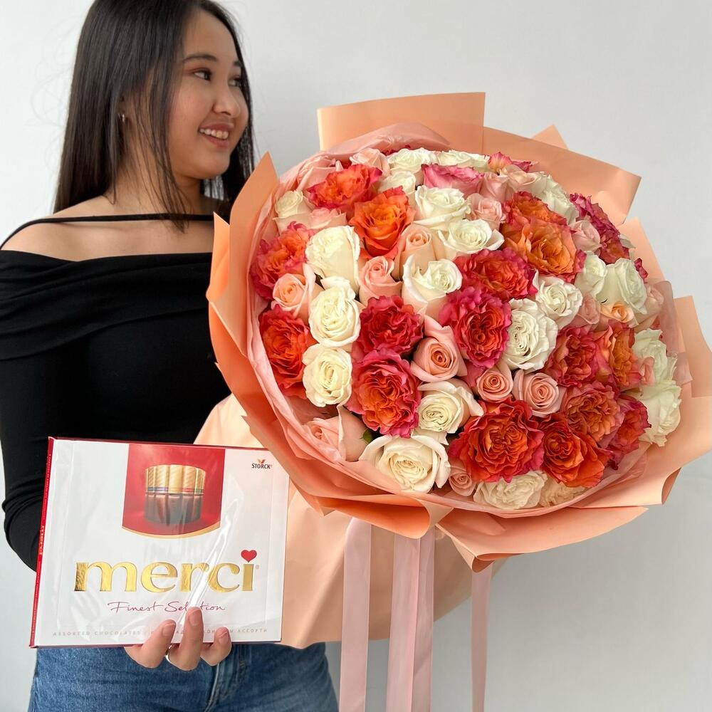 Rose - 75 pcs Designer packaging - 10 pcs Merci chocolate - 1 pcs
