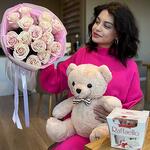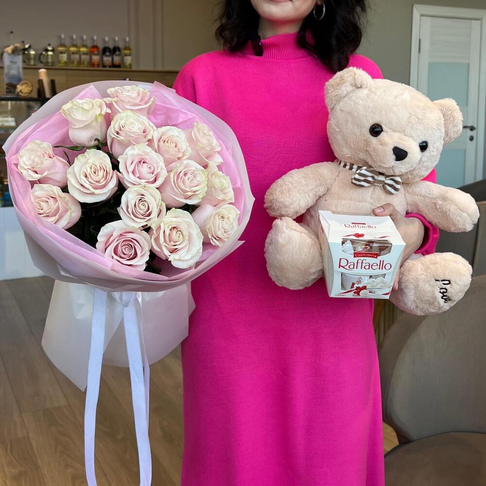 Raffaello - 1 pcs Designer packaging - 4 pcs Teddy bear - 1 pcs rose light pink - 15 pcs