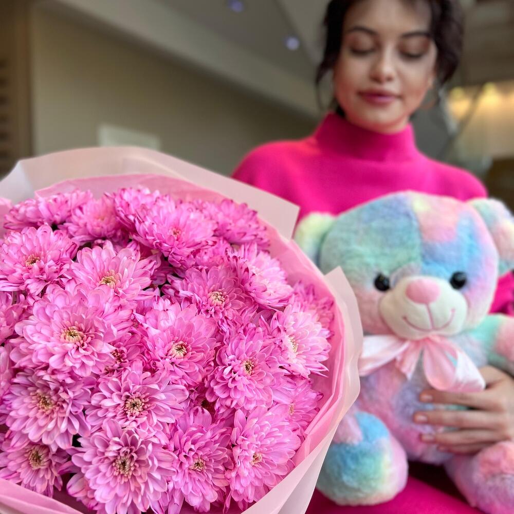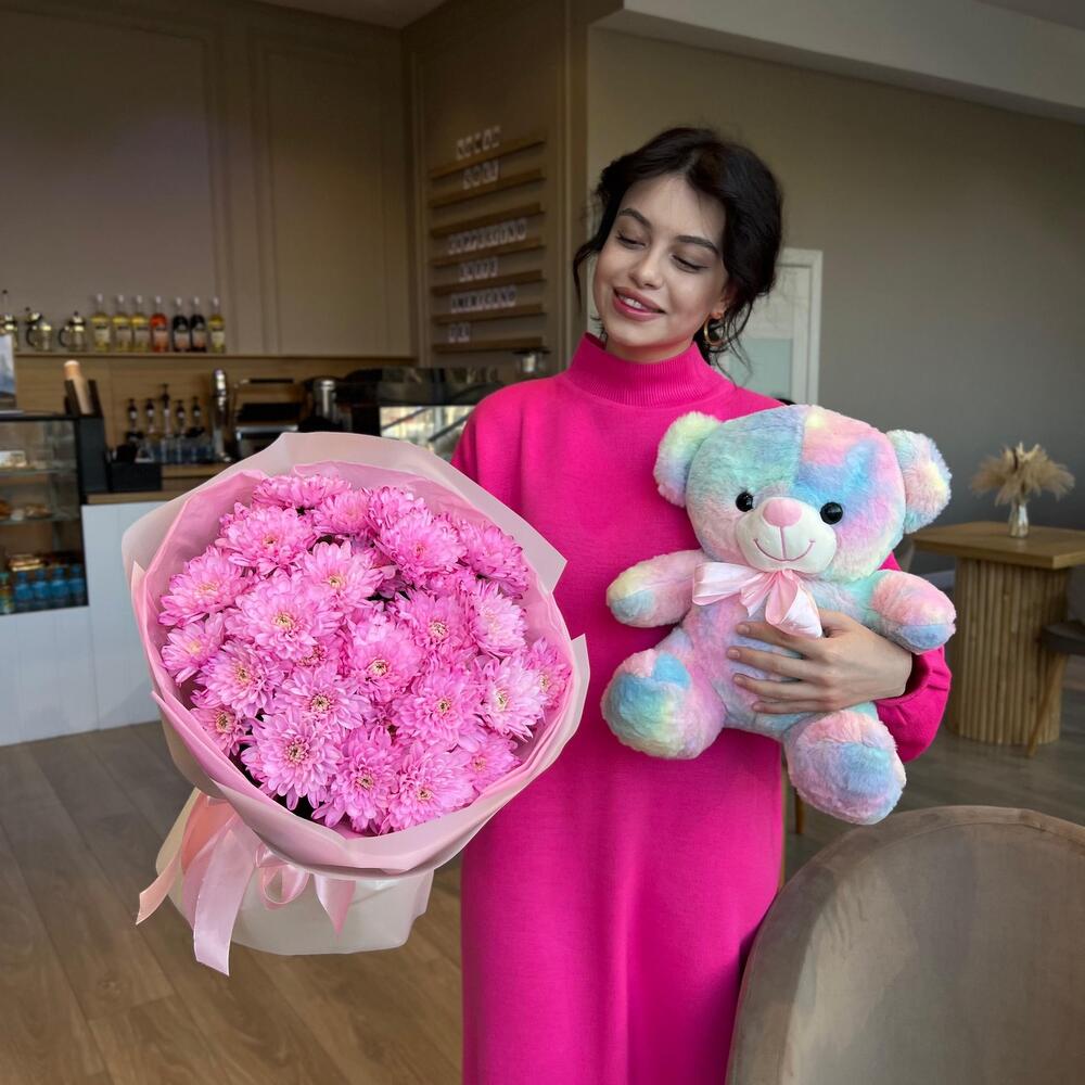 Комбо из розовых хризантем с радужным мишкой
