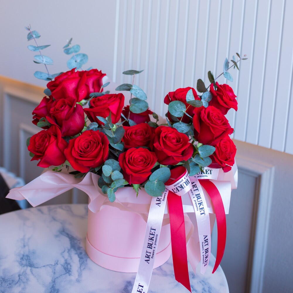 Eucalyptus - 1 pcs Box - 1 pcs Piaflor - 2 pcs Red rose freedom - 21 pcs