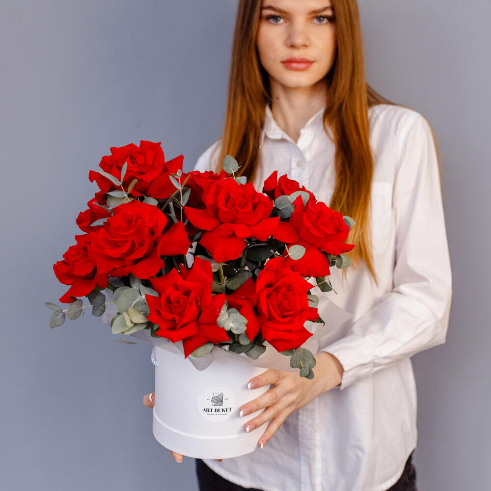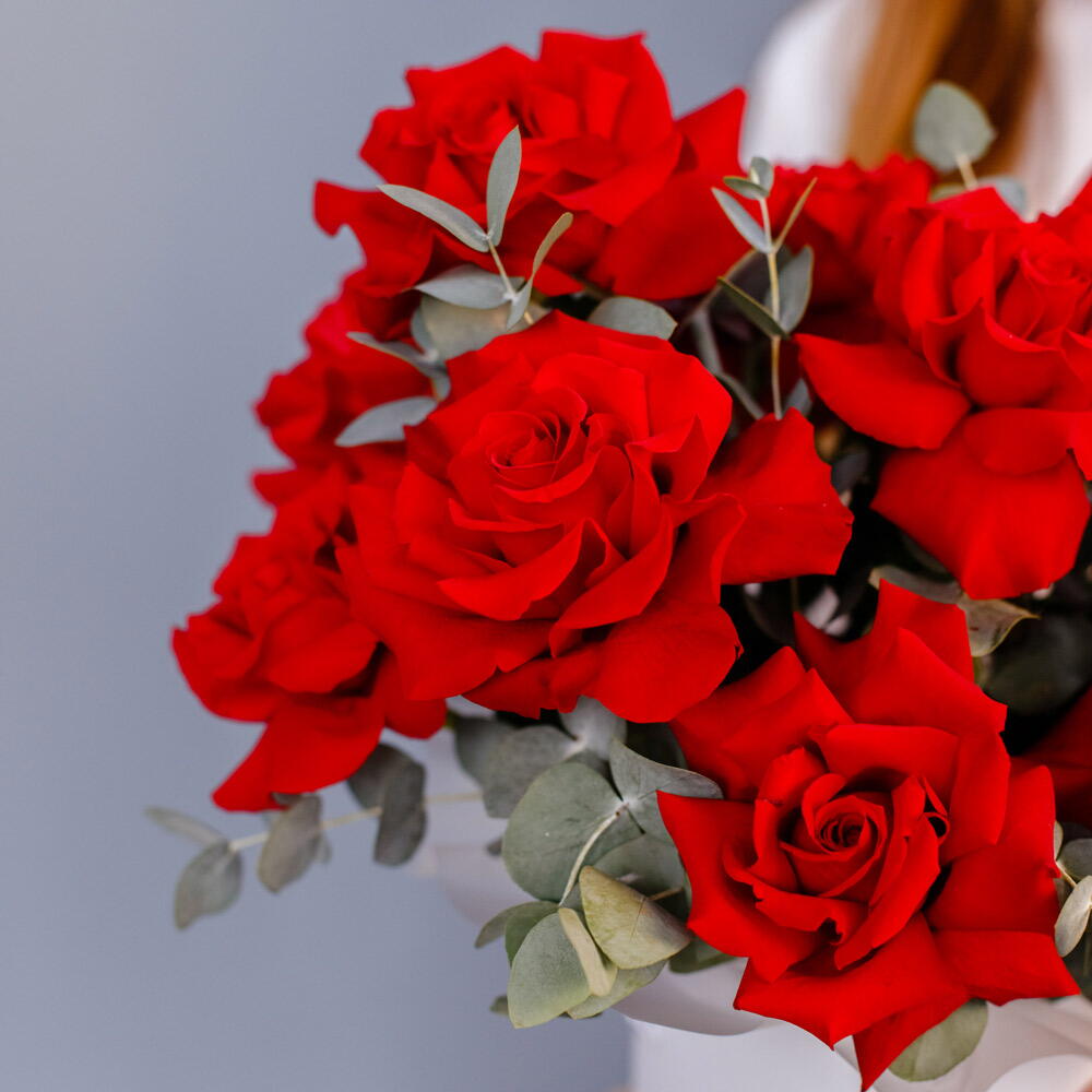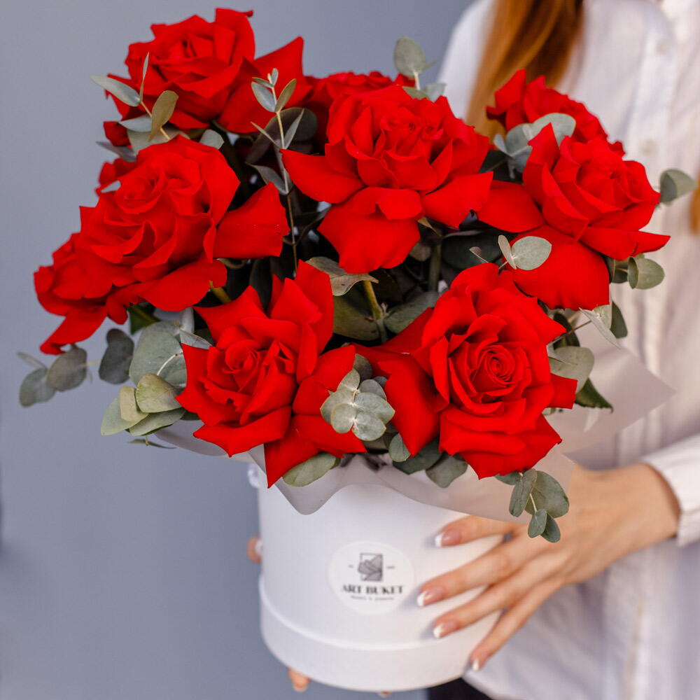 Rose red - 15 pcs Eucalyptus - 1 pcs Box - 1 pcs Piaflor - 2 pcs