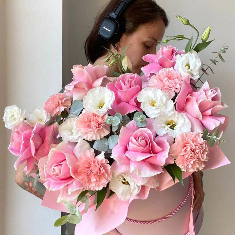 Eucalyptus - 1 pcs carnations - 7 pcs roses - 7 pcs Lisianthus - 5 pcs