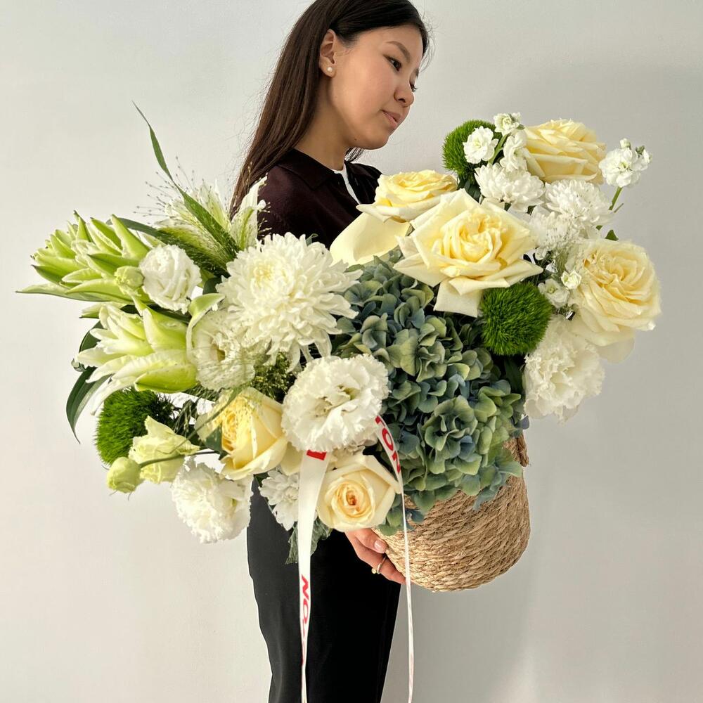 Lily - 1 pcs Matthiola - 1 pcs Panicum - 1 pcs One - headed chrysanthemum - 1 pcs chrysanthemums - 1 pcs peony - shaped roses - 6 pcs Dianthus moss - 3 pcs dutch hydrangea - 1 pcs eustoma - 3 pcs