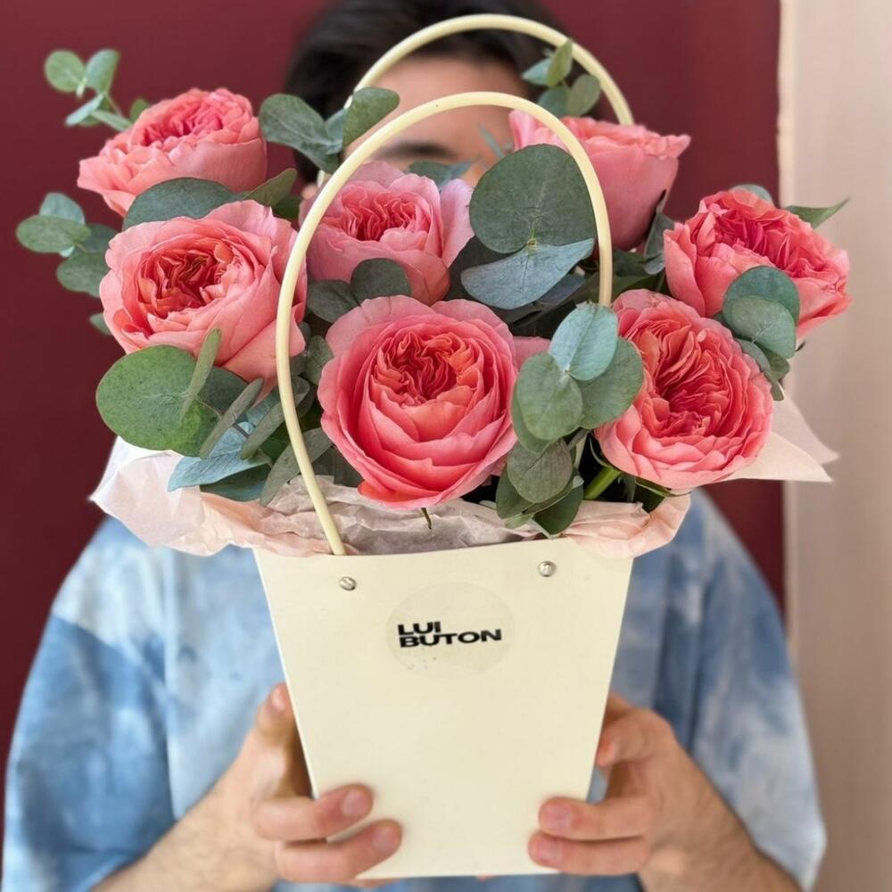 Пионовидные розы с эвкалиптом, собранные в этой композиции, словно частицы вдохновения. Они приносят уют и наполняют пространство особым очарованием