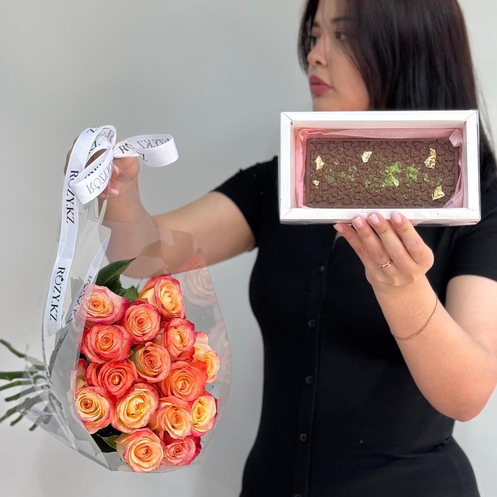 Композиция из роз в сумочке с «дубайским шоколадом»