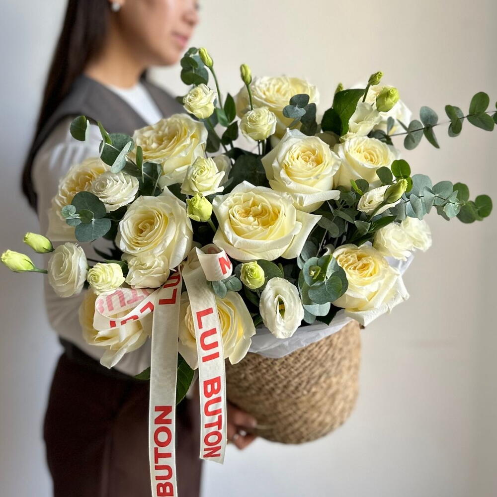 Композиция из пионовидных роз сорта Candlelight, эустом и эвкалипта в кашпо. Каждый цветок здесь будто рассказывает историю. О внимании, о тепле, о простых радостях — и о красоте, которая живёт в мелочах