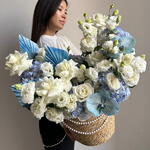 Hydrangea - 5 pcs Rose - 9 pcs Eustoma - 9 pcs orchid - 2 pcs palm leaf - 3 pcs