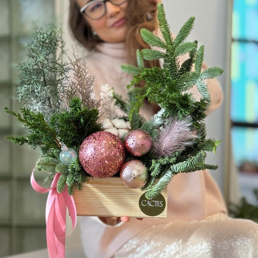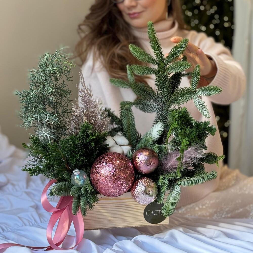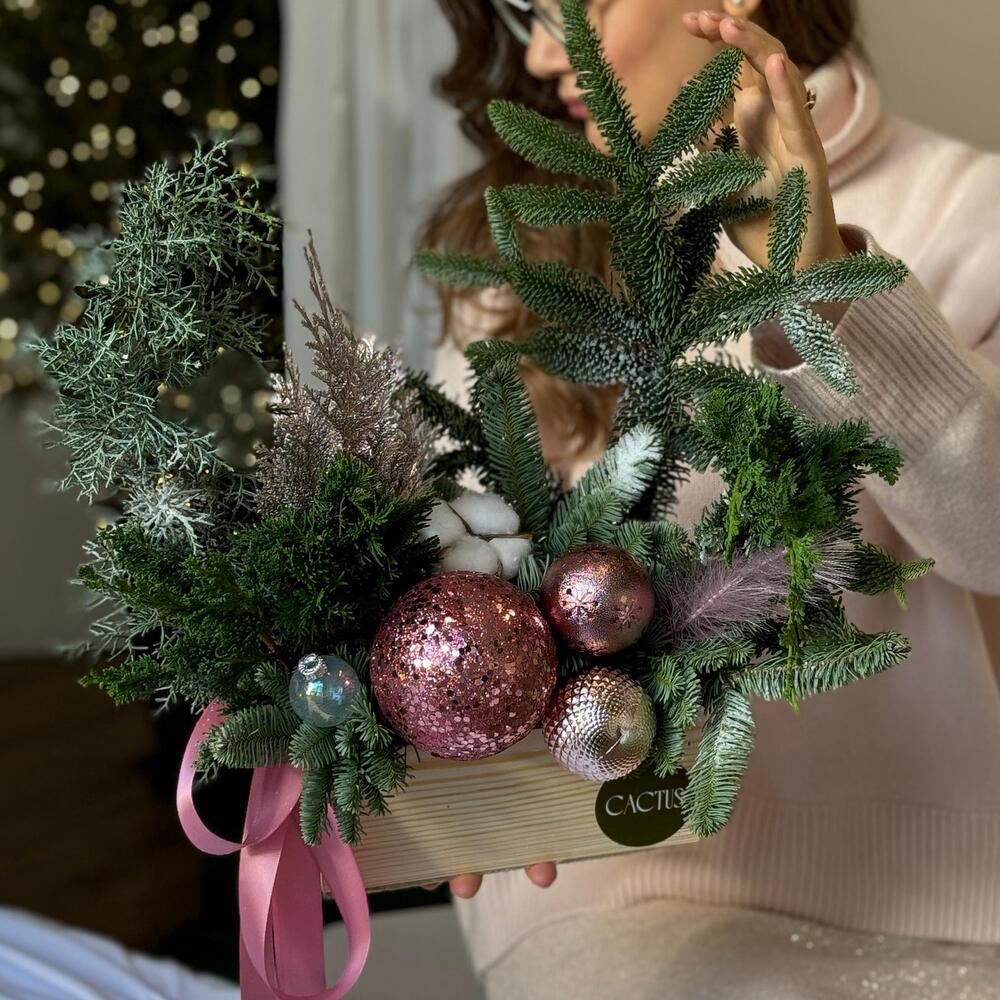 Cotton - 1 pcs Cypress - 1 pcs Wooden box - 1 pcs Tuya - 3 pcs Floral oasis - 1 pcs Christmas toy - 4 pcs nobilis (blue spruce) - 3 pcs