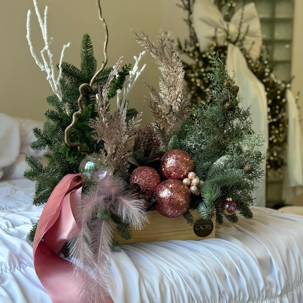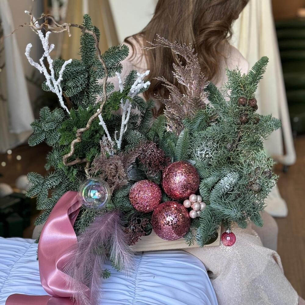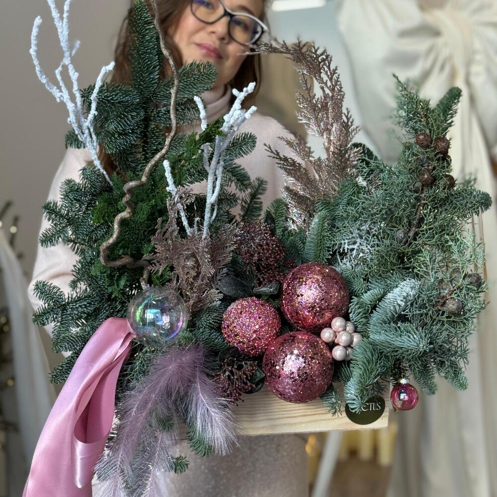 Skimmia - 1 pcs Cypress - 1 pcs Wooden box - 1 pcs Tuya - 2 pcs Nobilis - 4 pcs Floral oasis - 1 pcs Christmas toy - 12 pcs
