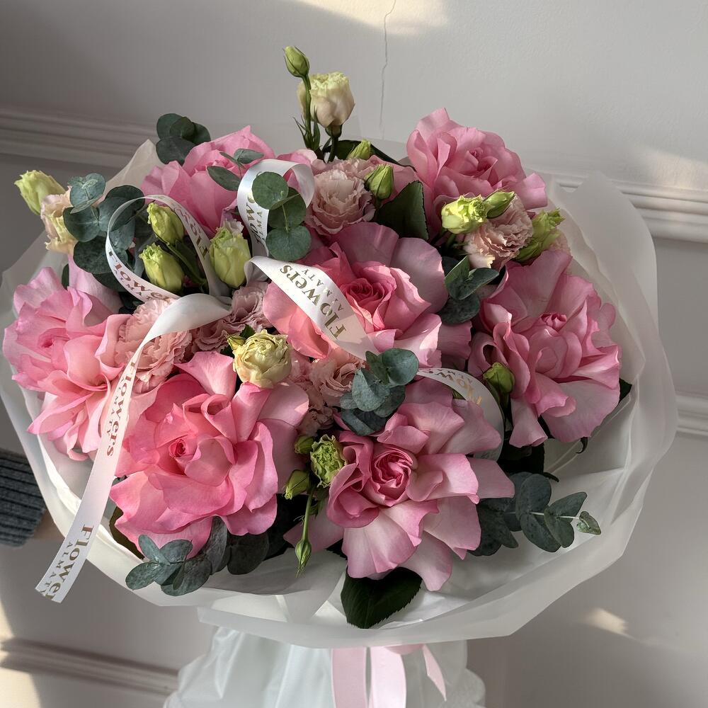 Lisianthus - 4 pcs Eucalyptus - 1 pcs French roses - 7 pcs