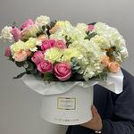 Hydrangea - 3 pcs Eucalyptus - 1 pcs carnations - 5 pcs roses - 9 pcs bush roses - 3 pcs
