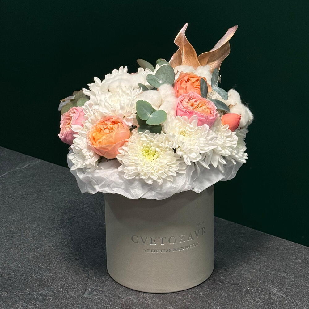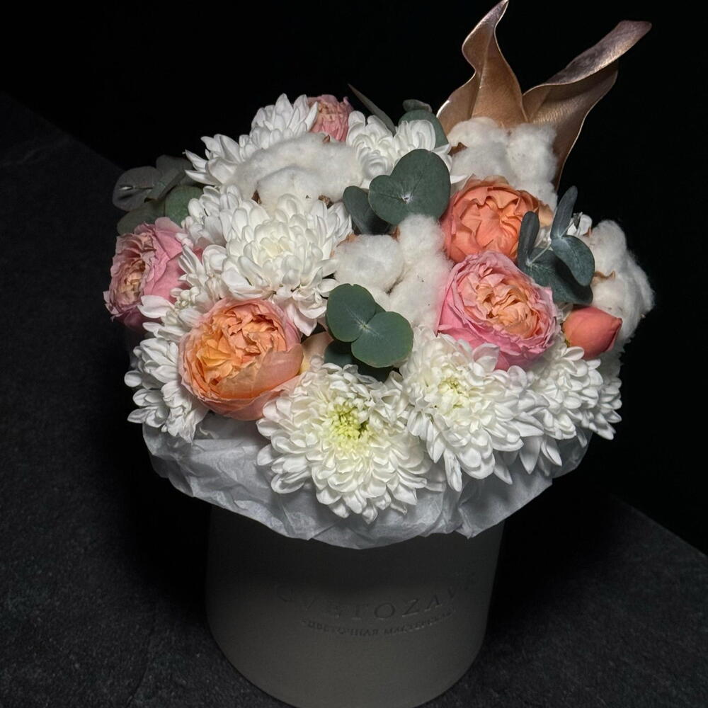 Arrangement in a box of chrysanthemum, spray rose, cotton and eucalyptus 🌸