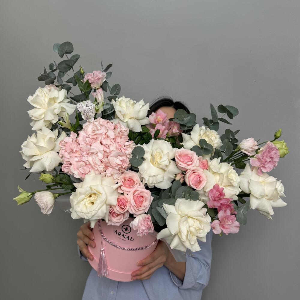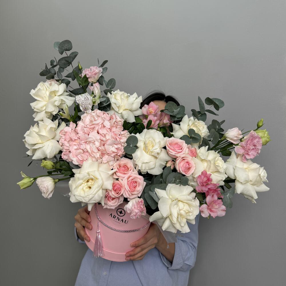Alstroemeria - 3 pcs Hydrangea - 1 pcs Eucalyptus - 3 pcs Rose - 9 pcs Bush rose - 2 pcs Eustoma - 4 pcs Box - 1 pcs