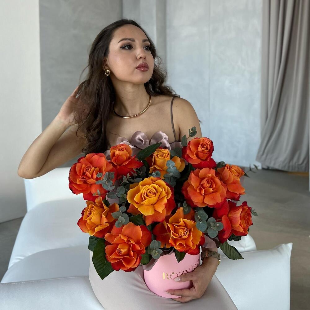 Eucalyptus - 2 pcs Designer packaging - 2 pcs Rose orange - 11 pcs Floral oasis - 1 pcs s size box - 1 pcs