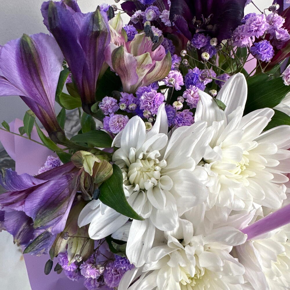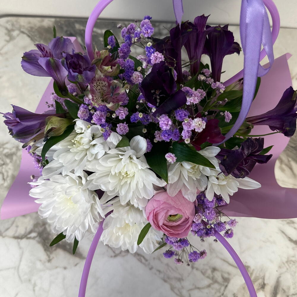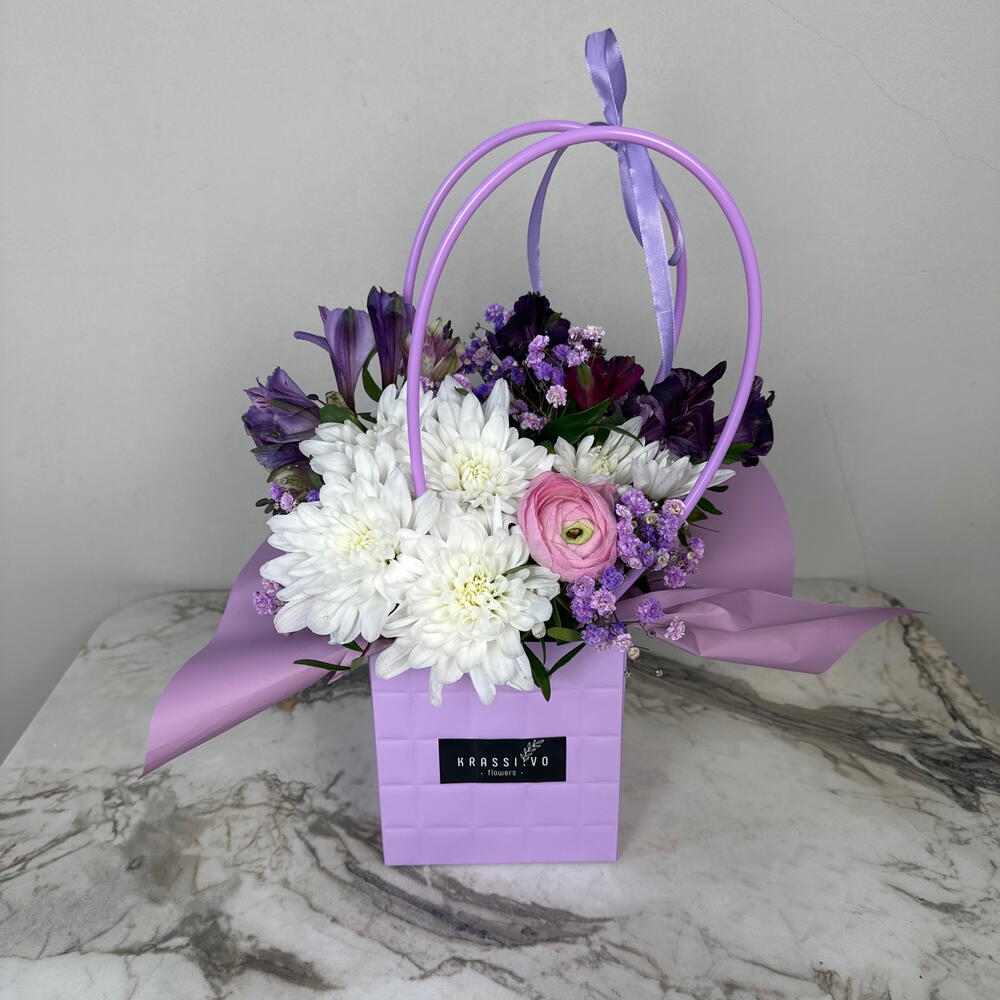 Alstroemeria - 2 pcs Chrysanthemum bush - 1 pcs Satin ribbon - 1 pcs Floral oasis - 1 pcs paper film - 1 pcs Ранункулус - 1 pcs сумочка xs картон - 1 pcs гипсафила ветка - 1 pcs
