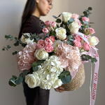 Hydrangea - 3 pcs Eucalyptus - 3 pcs Chrysanthemum - 3 pcs roses - 7 pcs bush roses - 5 pcs