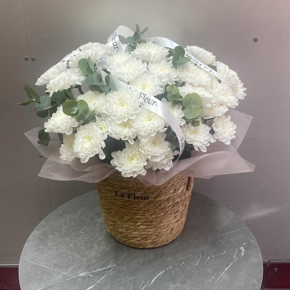 Basket - 1 pcs Eucalyptus - 3 pcs Bush chrysanthemum - 9 pcs