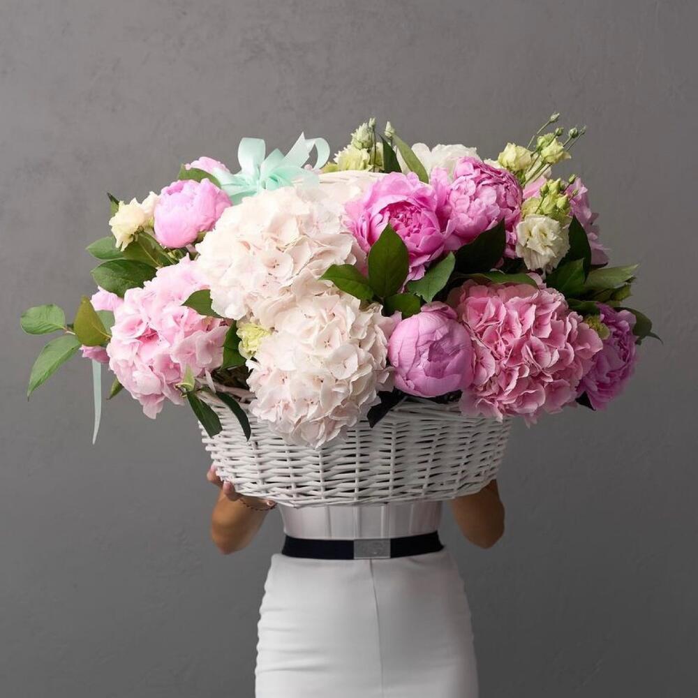 Hydrangea - 7 pcs The language is Russian. Here is the translation to English: "Ruscus" - 11 pcs Eustoma - 5 pcs roses - 7 pcs peonies - 5 pcs