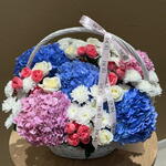 Hydrangea - 5 pcs Basket - 1 pcs Chrysanthemum bush - 5 pcs Rose - 9 pcs Bush rose - 5 pcs