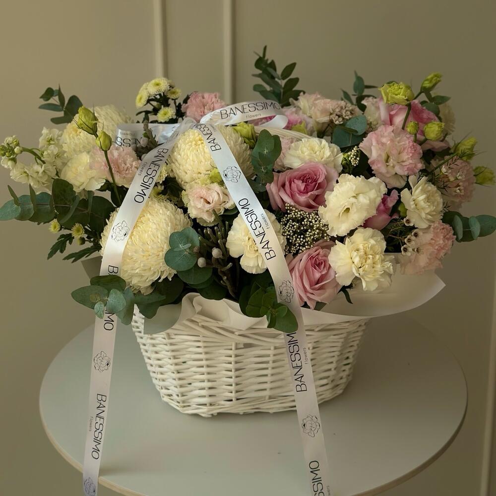 Eucalyptus - 2 pcs Carnation - 5 pcs Santini - 1 pcs Chrysanthemum one - headed - 3 pcs Basket wicker - 1 pcs eustoma pink - 2 pcs Mattiola is white - 1 pcs Ozotamnus white - 1 pcs eustoma white - 3 pcs Ohara rose - 4 pcs бакс флауерс - 1 pcs