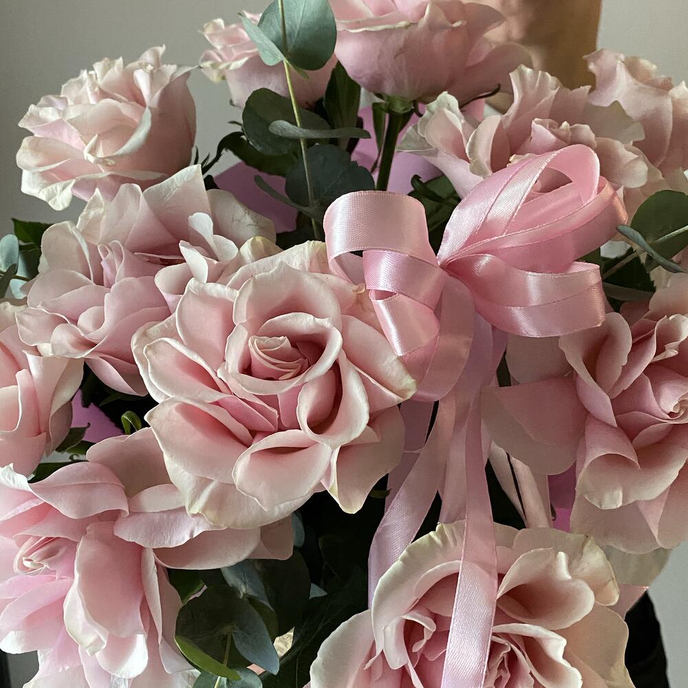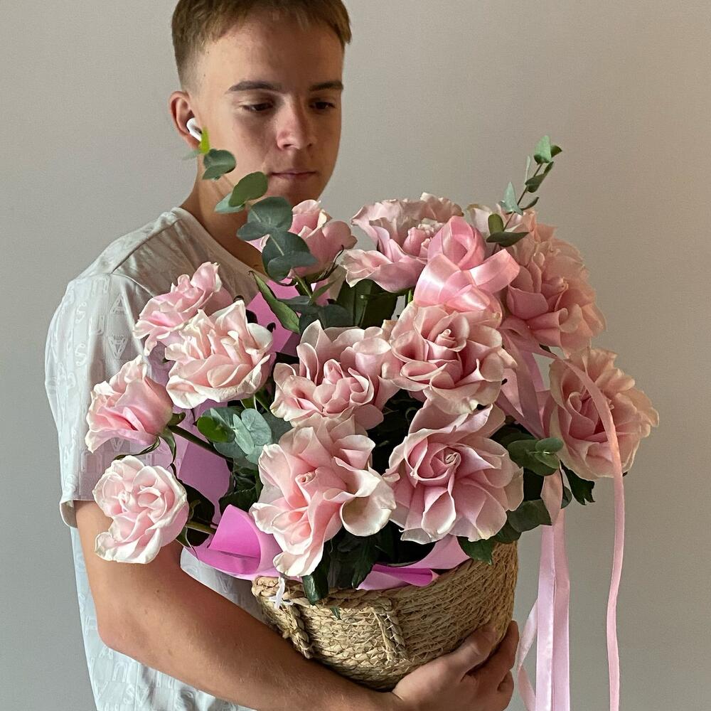 Eucalyptus - 2 pcs Rose - 13 pcs Satin ribbon - 2 pcs Basket wicker - 1 pcs Floral oasis - 1 pcs a postcard with your wishes - 1 pcs