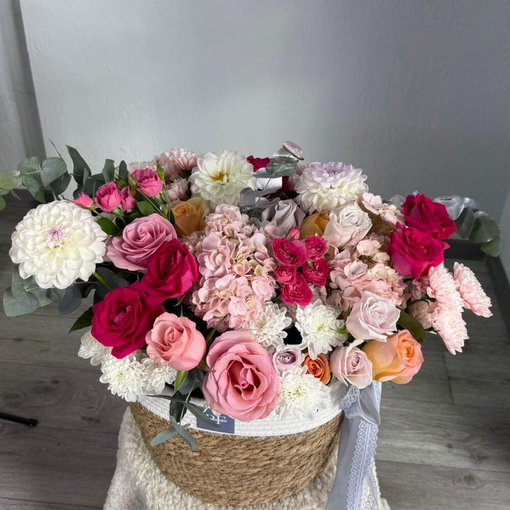 Basket wicker - 1 pcs Chrysanthemum single - headed white - 2 pcs Floral oasis - 2 pcs Eucalyptus Baby Blue - 5 pcs chrysanthemums bush - 7 pcs hydrangeas - 3 pcs roses ecuador - 19 pcs satin ribbons - 3 pcs спрей розы кустовые - 3 pcs