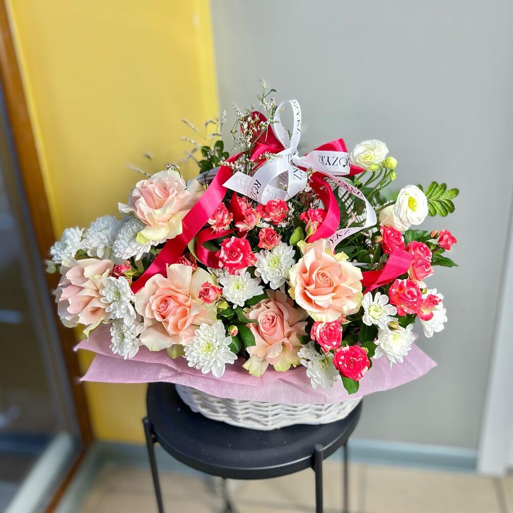 Lisianthus - 3 pcs Limonium - 3 pcs Chrysanthemum bush - 3 pcs Bush rose - 3 pcs Pistachio - 3 pcs French Rose - 7 pcs