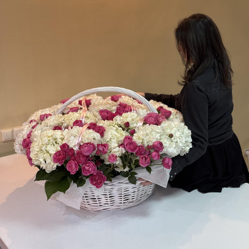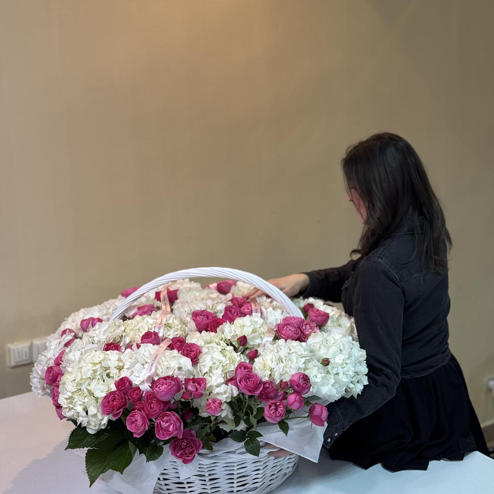 Basket wicker with oasis - 1 pcs peony spray rose - 20 pcs hydrangea premium mix - 21 pcs