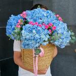 Bush rose - 5 pcs Eucalyptus - 2 pcs Oasis - 3 pcs Blue hydrangea - 5 pcs Basket rattan - 1 pcs