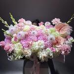Anthurium - 2 pcs Hydrangea - 20 pcs Matthiola - 10 pcs Carnation - 10 pcs Eustoma - 15 pcs Gladiolus - 5 pcs Basket wicker - 1 pcs Designer packaging - 5 pcs Crisal (top dressing) - 1 pcs Floral oasis - 4 pcs rose Ohara peony - 10 pcs dahlias - 10 pcs