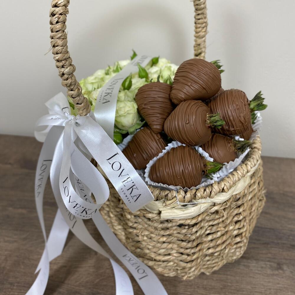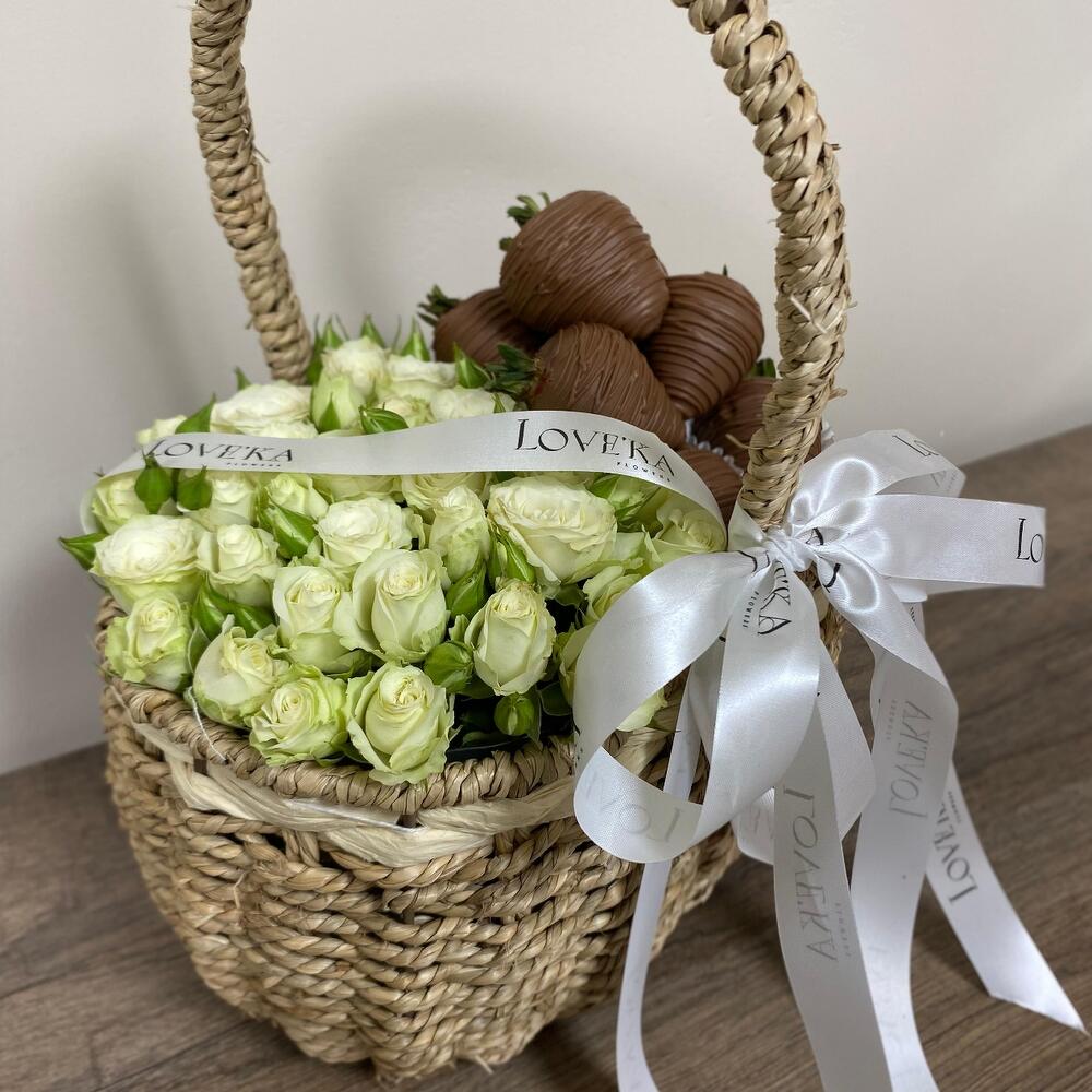 Нежная композиция в корзине, спрей розы в сочетании с вкуснейшей клубникой в шоколаде