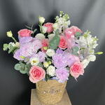 Matthiola - 2 pcs Chrysanthemum bush - 2 pcs Eucalyptus - 1 pcs Rose - 7 pcs Eustoma - 4 pcs