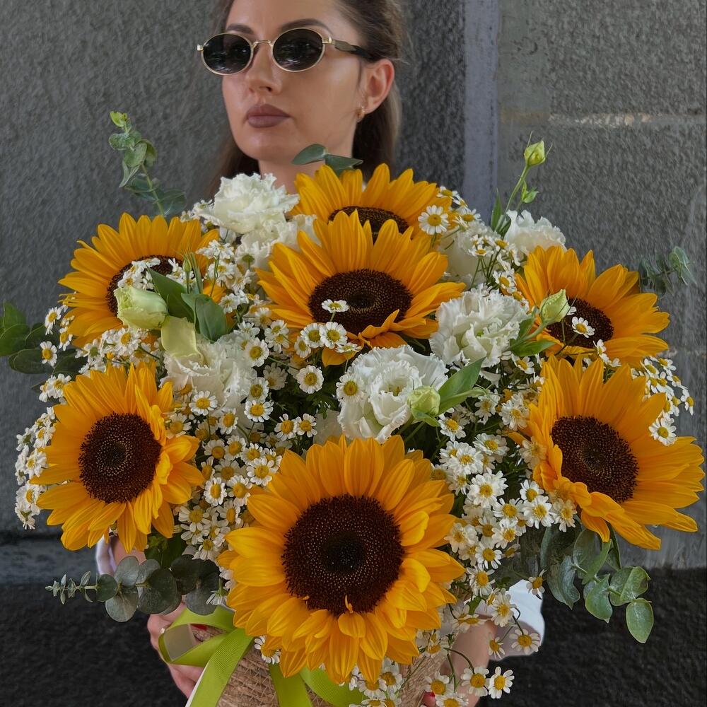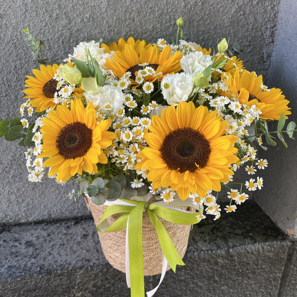 Eucalyptus - 3 pcs Lisianthus white - 5 pcs tape reps - 2 pcs planters rattan - 1 pcs подсолнухи летние - 7 pcs ромашка полевая летняя - 7 pcs