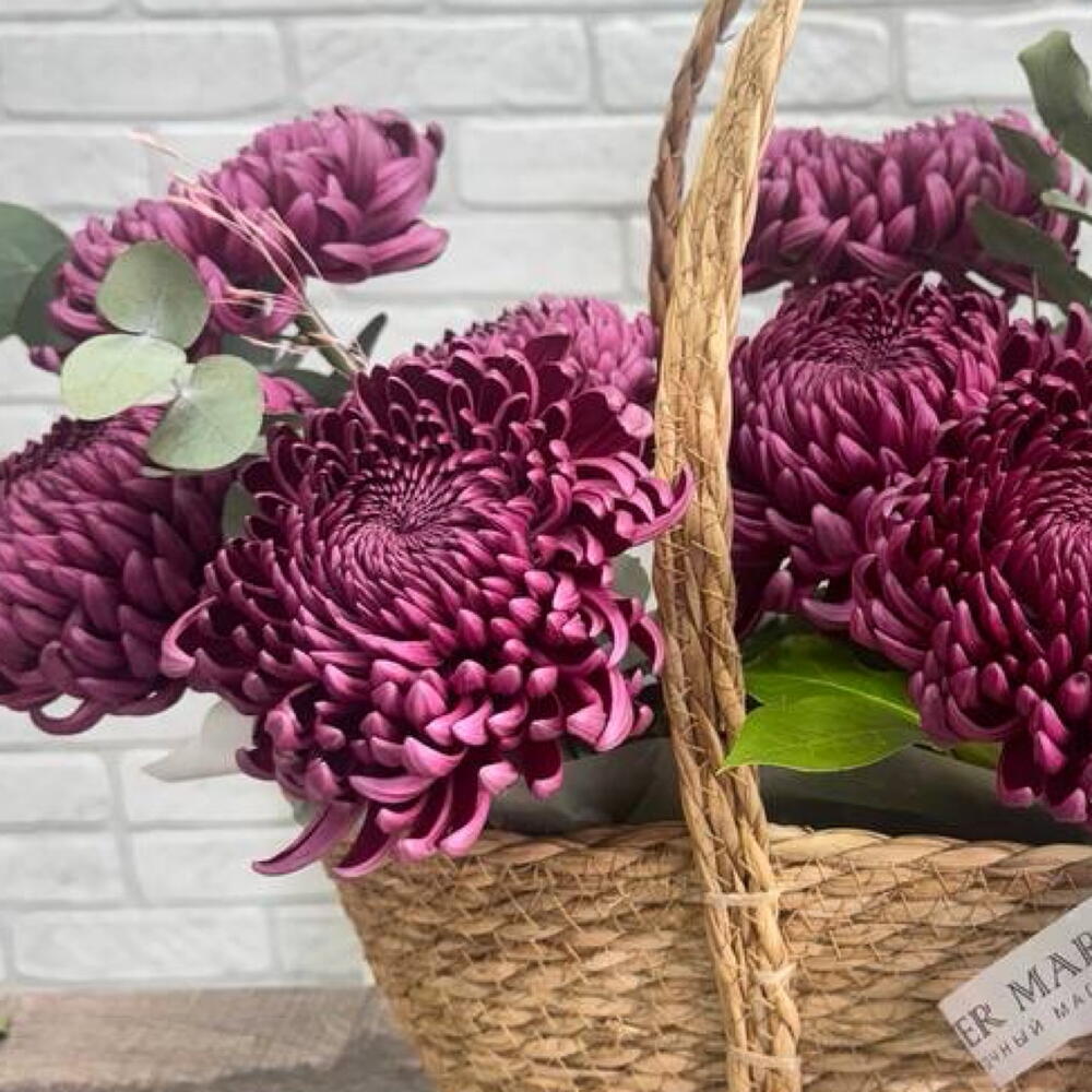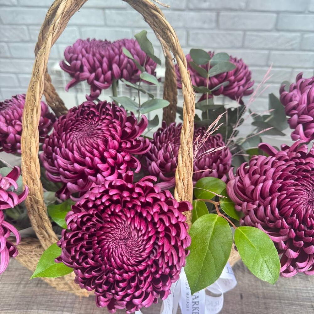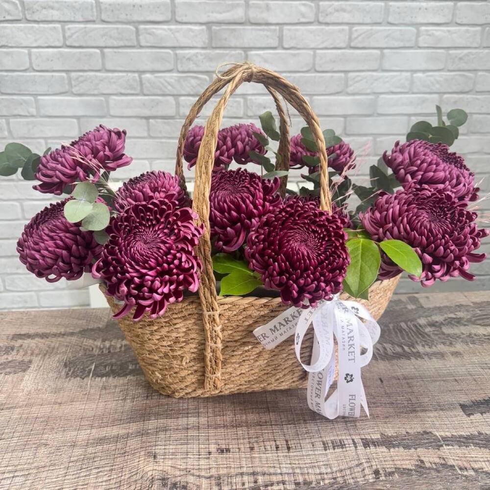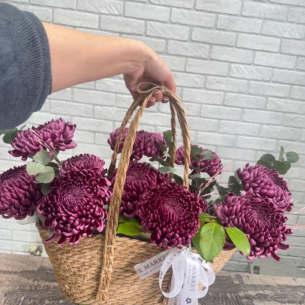 Tape - 1 pcs Eucalyptus - 5 pcs Floral oasis - 1 pcs pearl chrysanthemum curlers - 11 pcs корзинка плетеная сумочка - 1 pcs