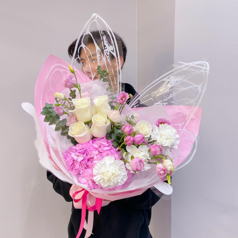 Hydrangea - 1 pcs Bush rose - 2 pcs Eucalyptus - 1 pcs Rose - 5 pcs Eustoma - 2 pcs Dianthus - 3 pcs