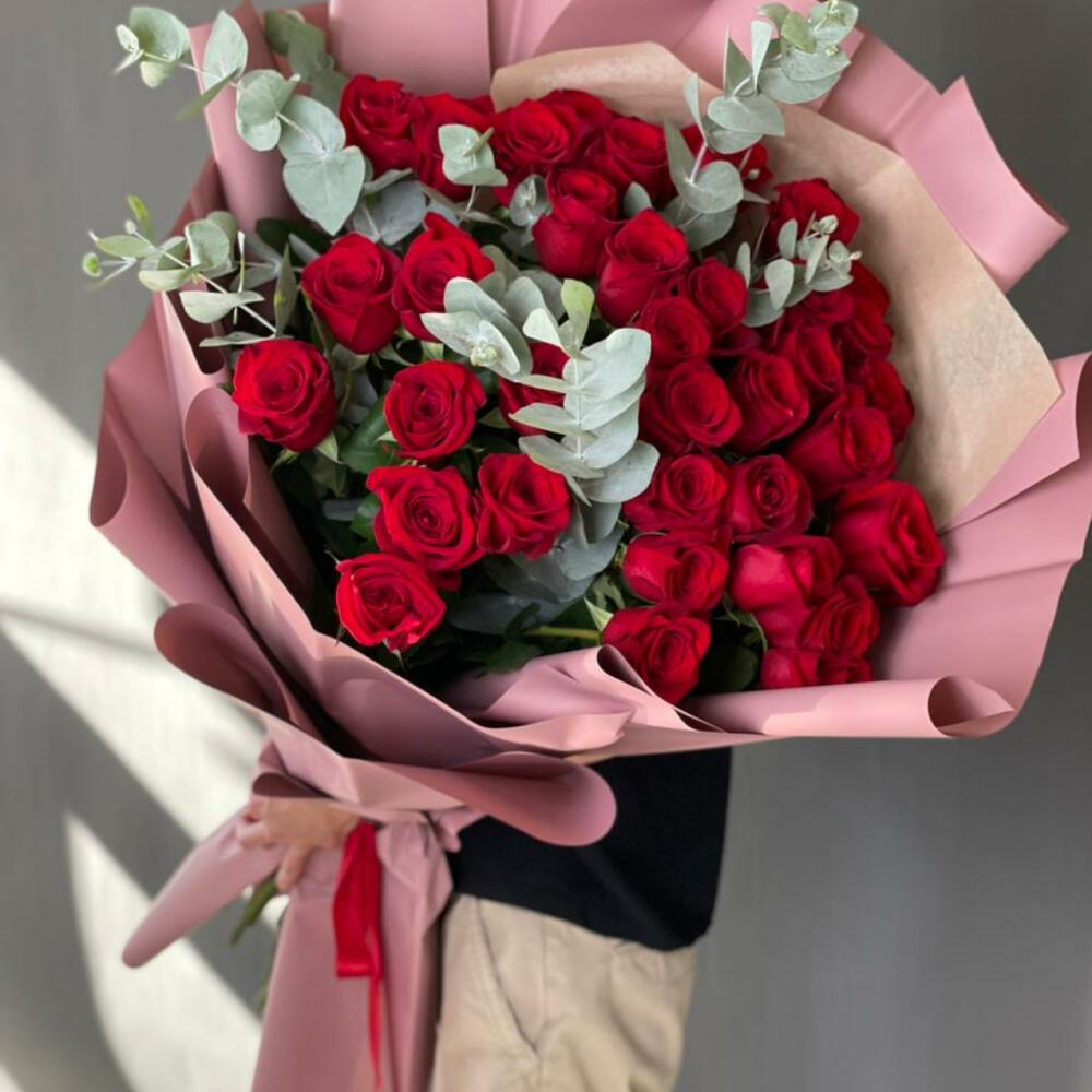 Red roses 35 pcs with eucalyptus