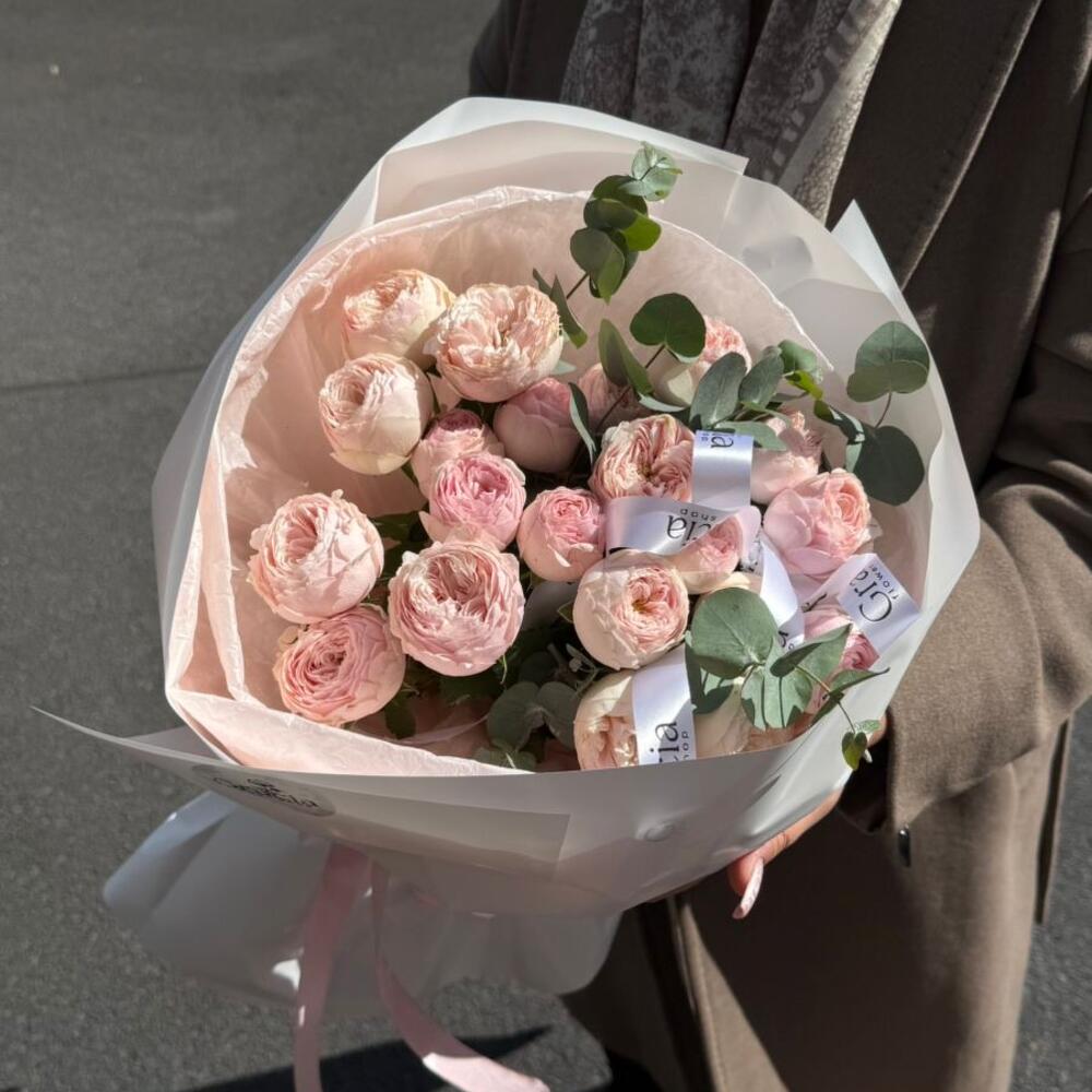 Eucalyptus - 1 pcs Designer packaging - 3 pcs Peony - shaped bush rose - 7 pcs
