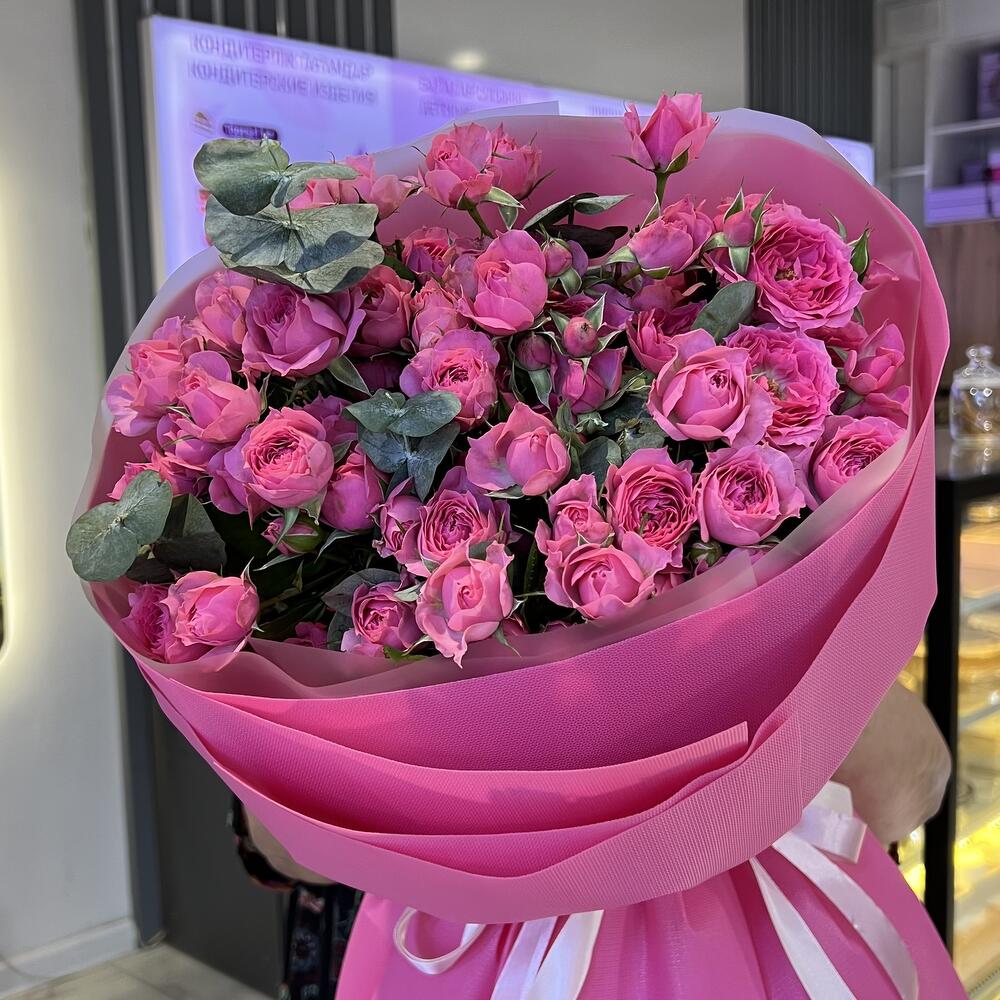 Букет из кустовых роз малинового цвета с добавлением эвкалипта, стойкость до 2х недель