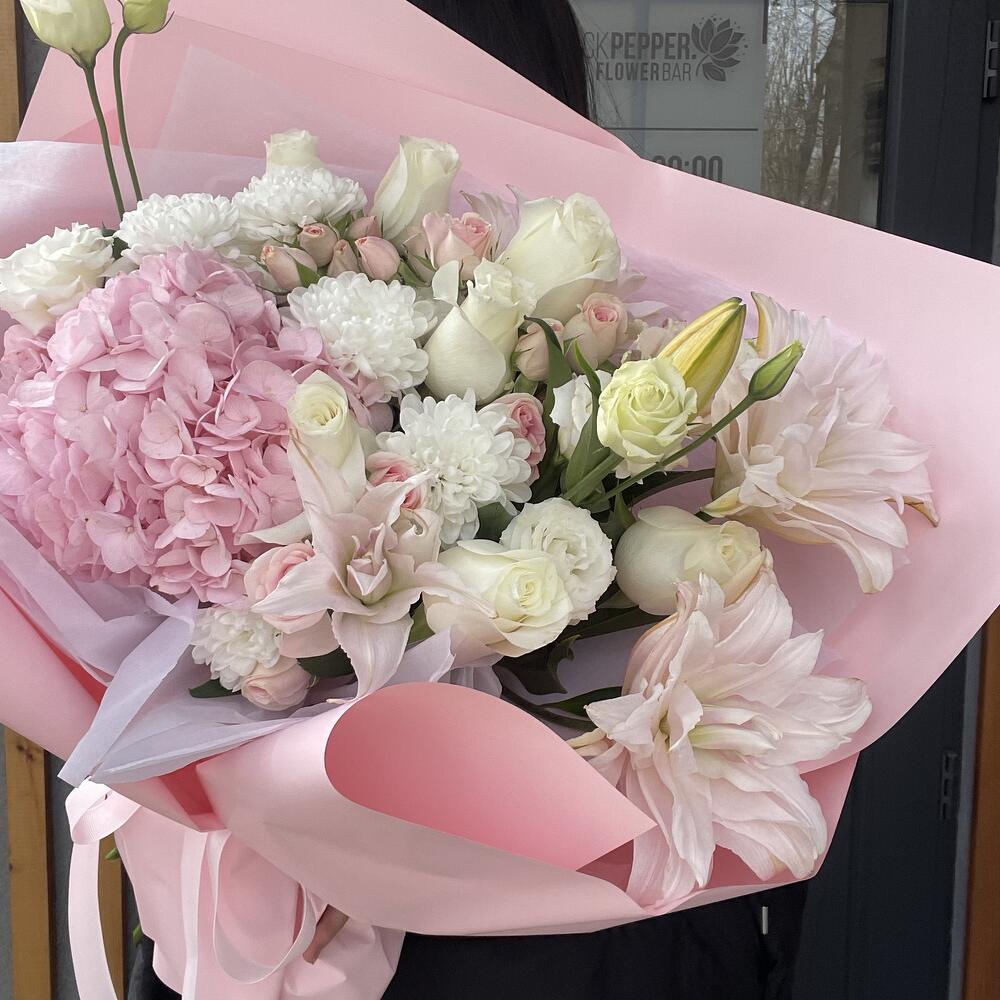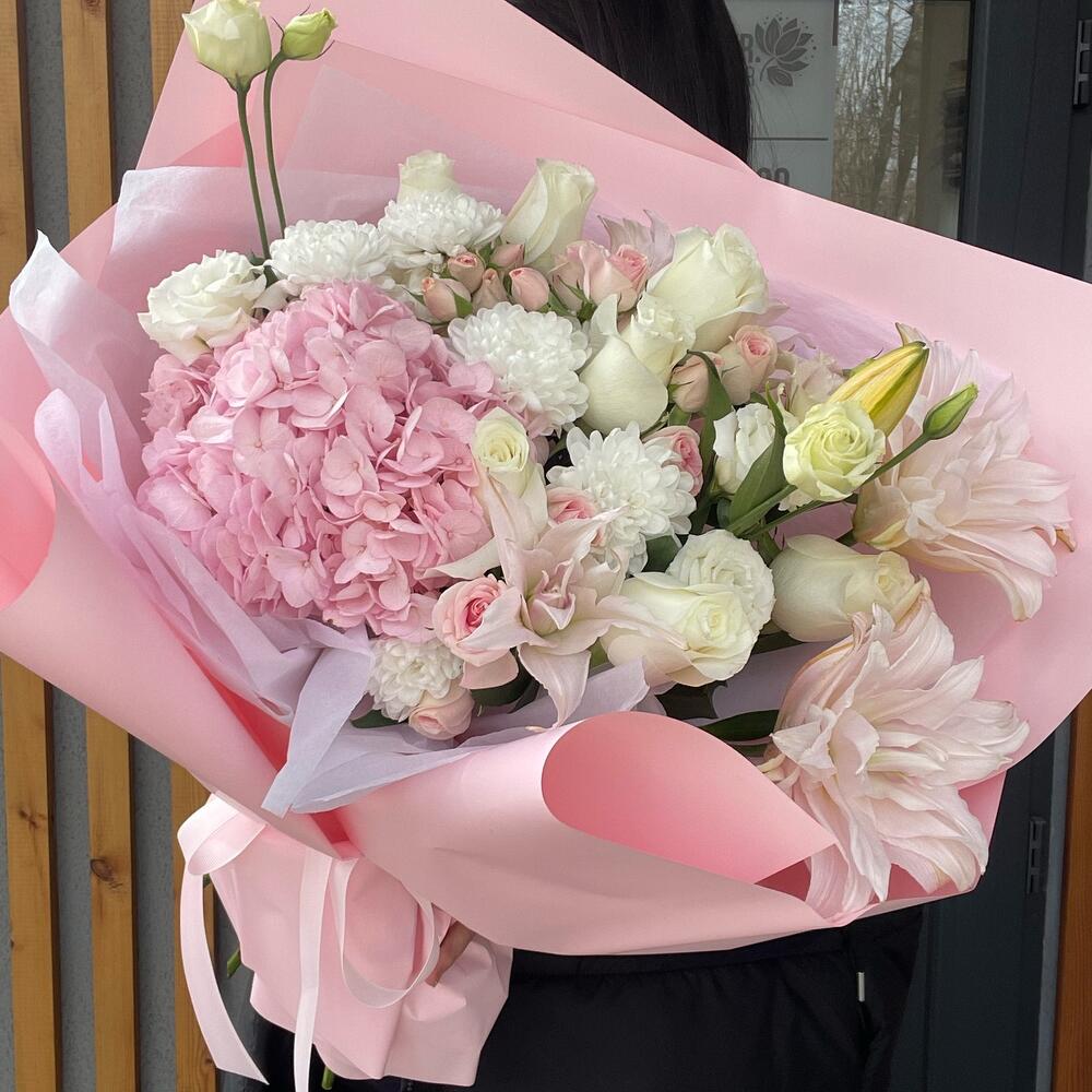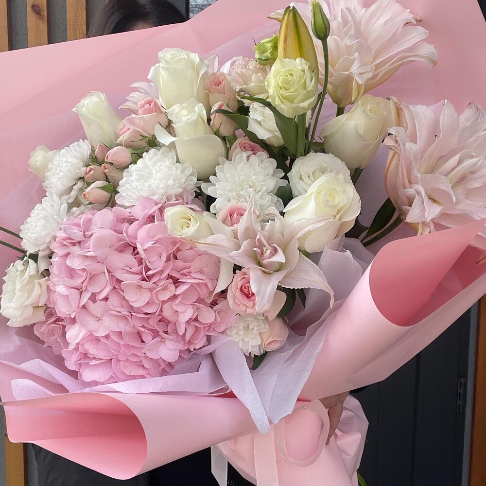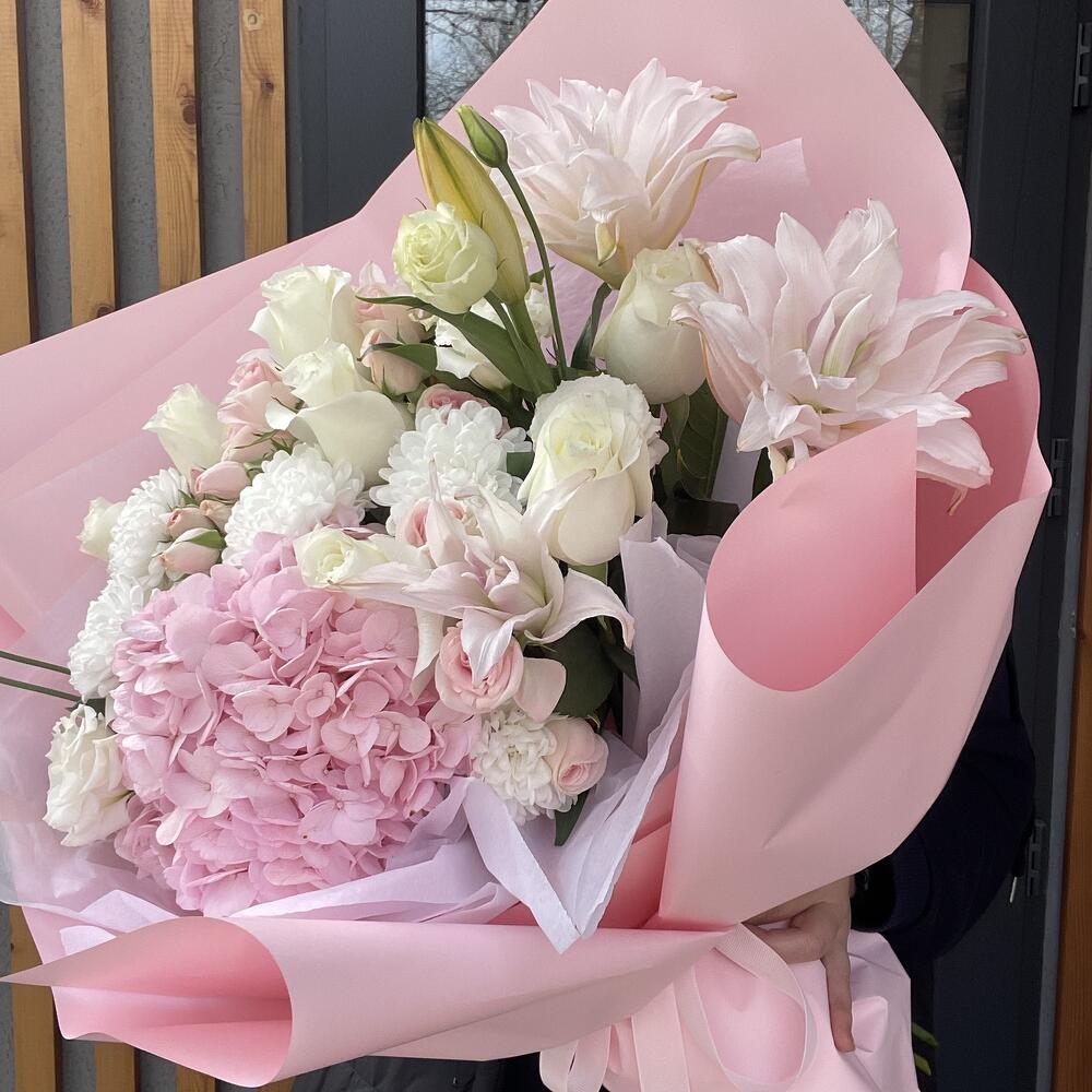 Hydrangea - 1 pcs Lily - 1 pcs Chrysanthemum bush - 2 pcs Rose - 7 pcs Bush rose - 4 pcs Eustoma - 2 pcs