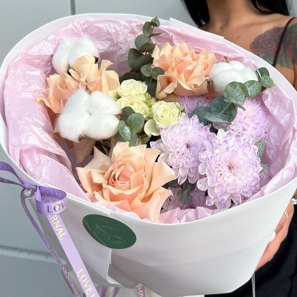 Как прогулка по лавандовому полю — этот букет наполнен спокойствием, нежностью и волшебством. Сиреневые хризантемы, персиковые цветы и хлопок создают воздушную и изысканную композицию. Подарите ощущение уюта и мечты.💜