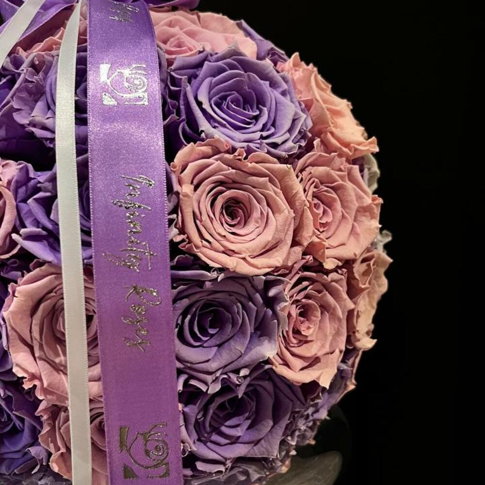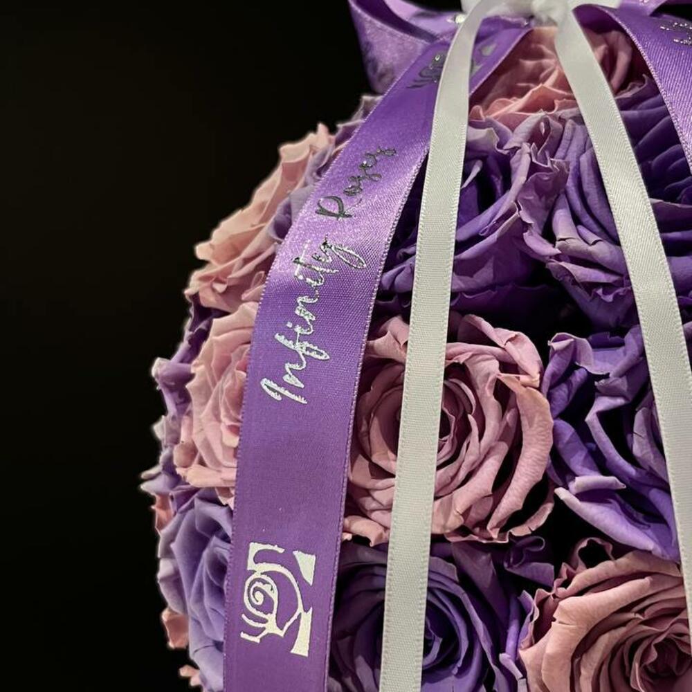 стабилизированные розы (лавандовые и пудрово-розовые) - 65 pcs атласные ленты с логотипом infinity roses (сиреневые и белые) - 2 pcs декоративная ваза (зеркальная) - 1 pcs