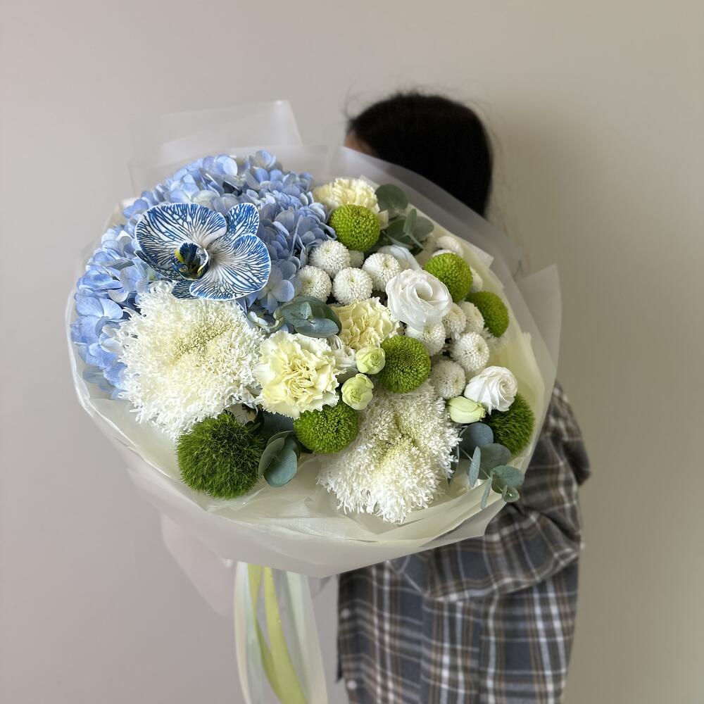 Букет, в котором сочетается глубина синей гортензии, утончённая красота орхидеи и солнечная свежесть хризантем. Белые и жёлтые оттенки создают гармоничный контраст, а нежная зелень мха придаёт композиции матовую мягкость и природное очарование. Такой букет станет ярким акцентом и подарит ощущение лёгкости и радости.