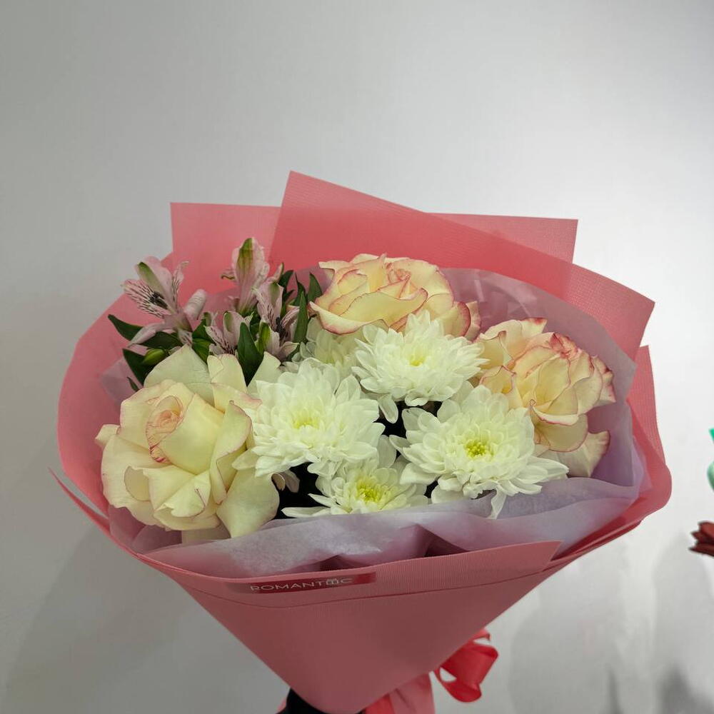 Этот авторский букет станет идеальным проявлением ваших чувств. Утончённая альстромерия, пышная хризантема и тройной шарм нежных роз образуют цветочную симфонию, подчёркивающую вашу изысканность и вкус. Каждый цветок в букете говорит о теплоте и искренности переживаний, делая этот подарок незабываемым.