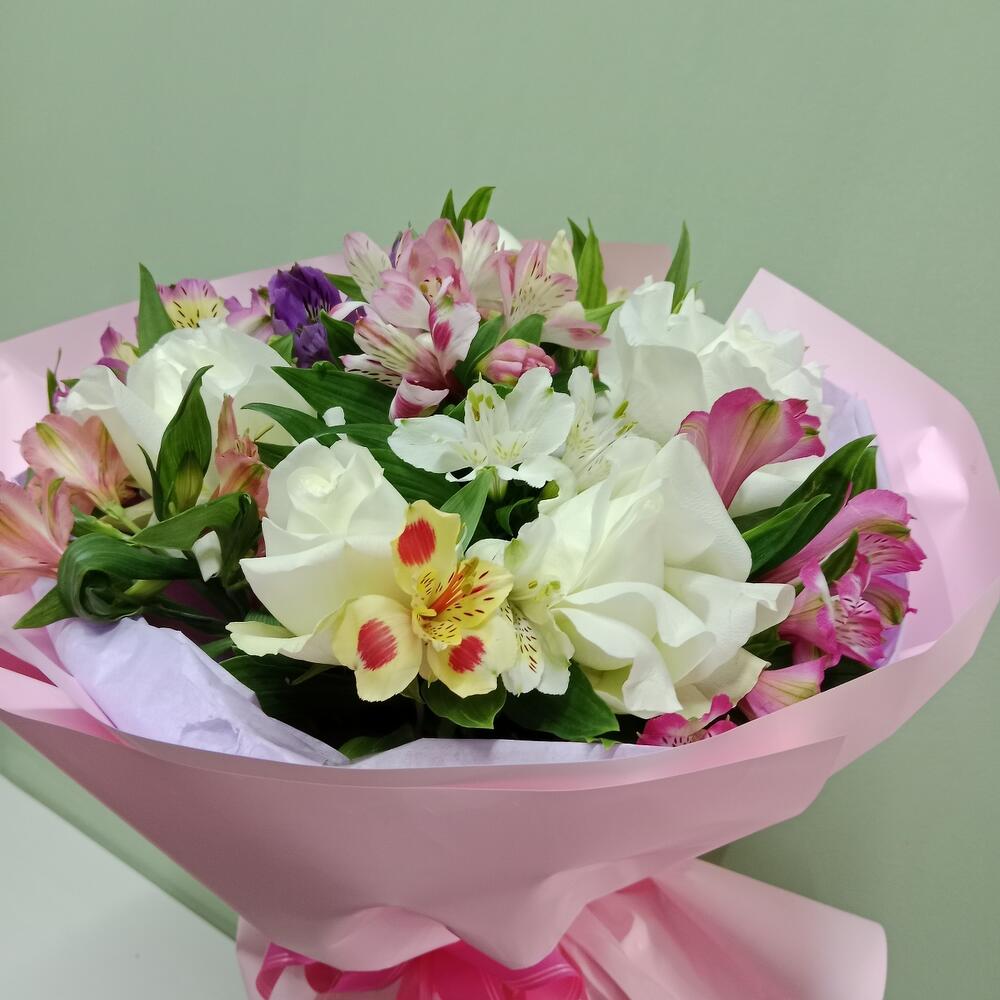 Этот изысканный букет сочетает в себе элегантность белых роз и яркость цветных альстромерий. Нежные, словно облака, розы символизируют чистоту и искренность чувств, а игривые альстромерии добавляют композиции энергии и тепла. Такой букет станет идеальным подарком для особого случая, подчеркнёт утончённый вкус и передаст самые тёплые пожелания.